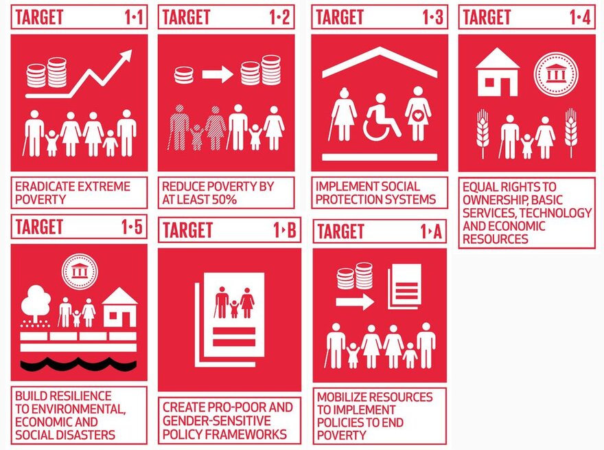 The aim of SDG 1 No Poverty is to end poverty in all its forms worldwide by 2030. This should be achieved by eradicating extreme poverty, halving poverty in all its dimensions, implementing social protection systemsn, ensuring access to basic services and resources, and building resilience for vulnerable populations against shocks and disasters.